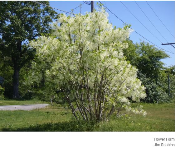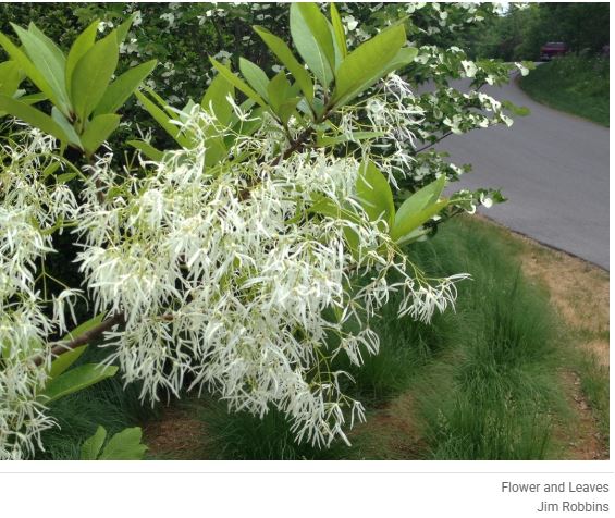 Fringetree is a small, deciduous tree in the olive family (Oleaceae). It is native to the eastern U.S. Its genus name comes from the Greek chion meaning “snow” and anthos meaning “flower.” The species epithet is Latin for “of Virginia.”