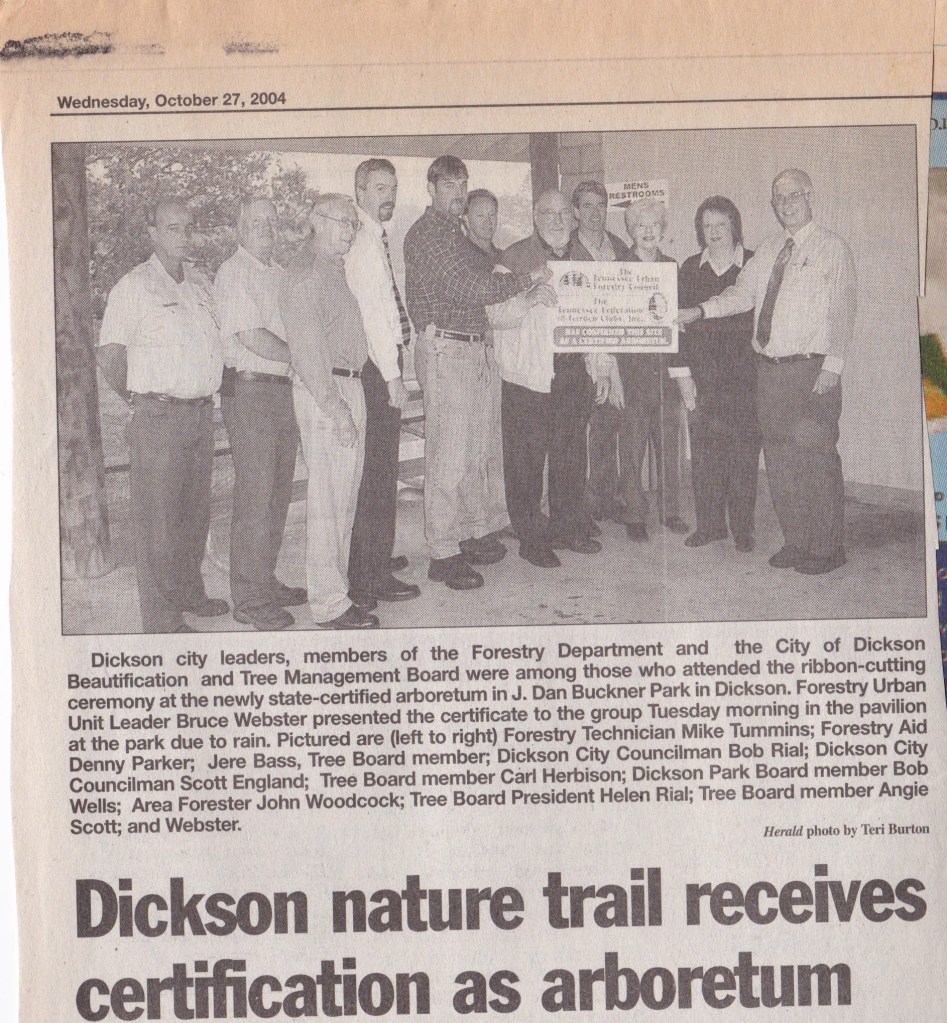 bridge at arboretumDr. Jere Bass, Terry Adkins, Randy Baker, John Woodcock, Carl Herbison, Karen VanLeeuwen, Helen Rial.Fall 2004First Methodist Beautification Award 20030603Girl ScoutsDickson Herald 20041007John WoodcockWarner Taylor and Anita – Noon Rotary Award