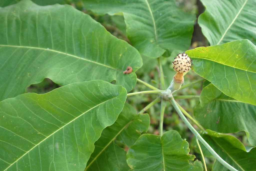 - large green leaves with silvery pubescent undersides, measuring 3 feet long and 1 foot wide